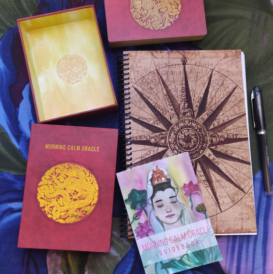 I also intuit that the guidebook as an operation manual only skates at the surface of what the Morning Calm Oracle cards can do. This deck feels powerful, feels highly capable of helping us navigate the enigmatic, and so with this guidebook, it’s a bit like being handed a scientific graphing calculator, but the manual it comes with only teaches you how to do addition and subtraction with it.