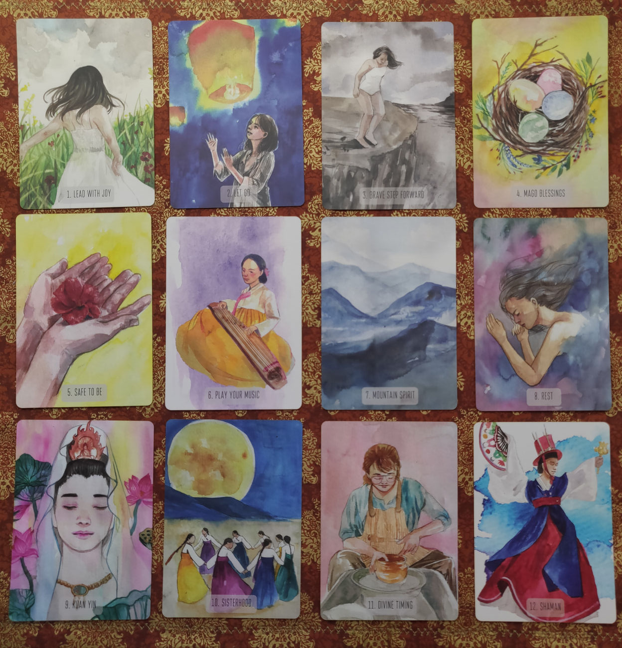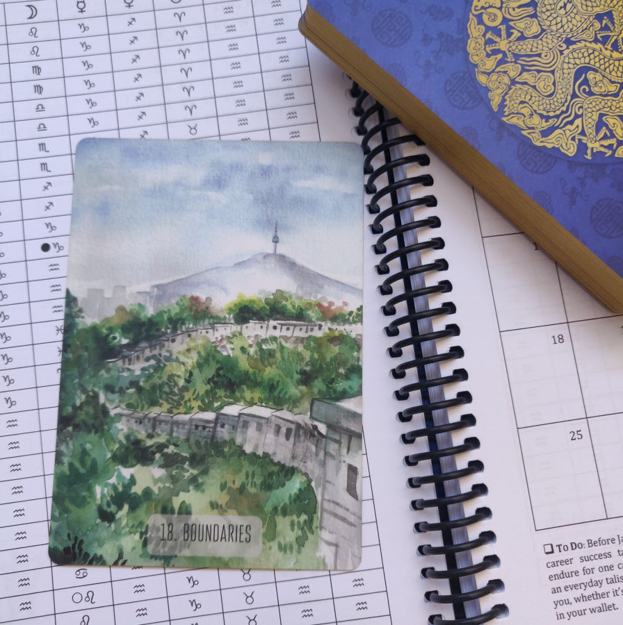 I couldn’t find any statements on the medium used for the artwork, but my best guess is watercolor. Some of the illustrations look like they may have been done in gouache. The linework feels soft, like ballet, or staying in theme, a seungmu dance (click here for a YouTube video that explains this dance) with colors that seem to flow into one another, an unbroken channel of energy that runs as an undercurrent through the cards.