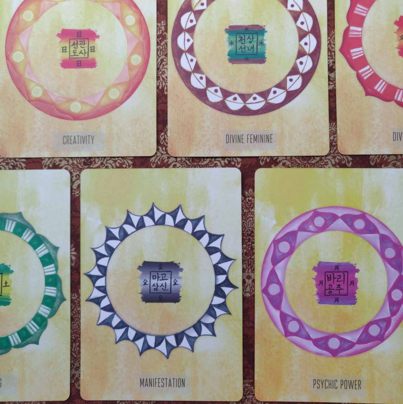 There are seven sigil cards (with the red card backs) that petition seven different guides for purposes such as cleansing, creativity, harnessing your divine feminine, your divine masculine, for healing, manifestation, and for psychic power. These are also the seven core elements in the shamanistic practices of Kelleher: Water, the Sun, Tree, Fire, Earth, Metal, and the Moon.
