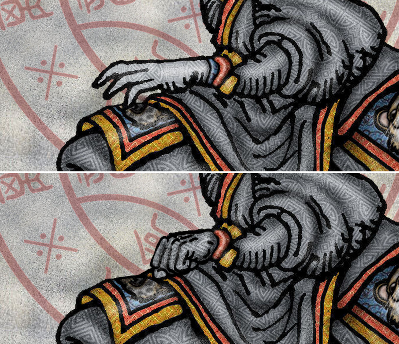 Here’s another example from the same art print. The top version above shows the original line work for the left hand I drew and scanned in. At the actual physical size that the black and white illustration was in, it looked fine, in context. But once you’ve added color and you’re trying to present it as a standalone art print, it wasn’t good enough. Hence the digital re-draw to a closed fist in the bottom version.