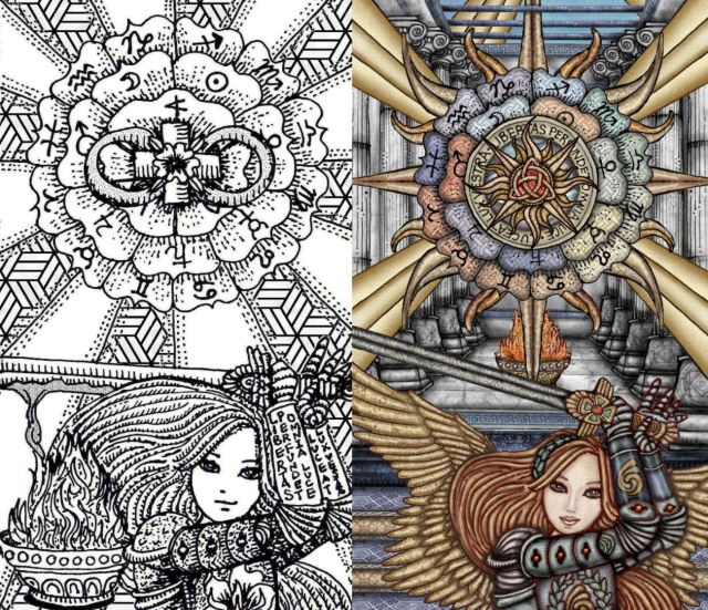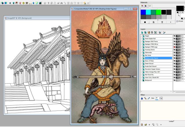 When I first started, I would try to color in a fully-formed flattened composition. My technique evolved to where I started to draw the key features of the composition separately, and then scanned them in separately. And then I’d “assemble” the separate features. This way I didn’t need to get my composition right on the first try. Because for every single card– every— my first few attempts at the composition were always off. I had to keep experimenting and move things around before I got it anywhere near right.