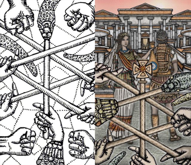 In the above hyperlink to an Introduction page for Spirit Keeper’s Tarot: The Revelation, I get into my concept for the third edition and my personal stylistic approach to the artwork.