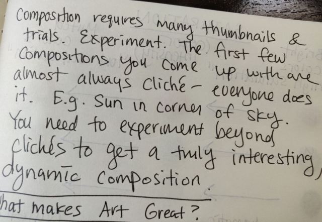- Write out a list or go searching for and then make a list of your all-time favorite works of art or illustration. Scrutinize the heck out of the deconstructed elements of composition in each work. Why is that work of art so great? What did that artist do in terms of line work, or conveying shape, or texture, or sense of movement in that composition that moves you?