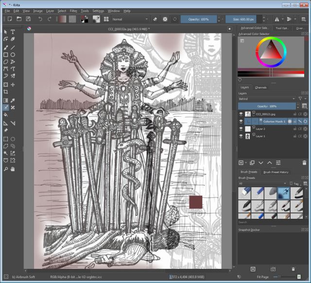 I got my friend and fellow deck creator Jamie Sawyer to show me a couple of basic functions in Krita, like how to select a section on your image, how to select a paint brush, how to select a color, and then how to color in that selected section. And she also showed me how to create layers.