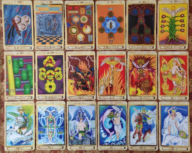 One of the things that made me think was how similar my experiences with creating my deck were to Meleen’s path with the Rosetta Tarot. Meleen describes the initial intention of the Rosetta to be “the love-child of the Thoth tarot and the Rider-Waite-Smith tarot. As it evolved the genes of the Thoth parent proved dominant. (As a friend commented, ‘Thoth is kind of like that.’)” Whoa! I experienced the same exact situation with my SKT! With the SKT, I think physically it resembles the RWS more (whereas the Rosetta is quite unequivocally taking on the physical attributes of the Thoth). But echoing what Meleen says about her experience, I also feel like the SKT ended up with a personality that’s predominantly Thoth.