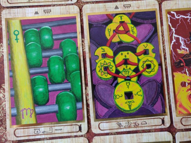 I love all the nods to the Thoth, but love even more the ingenious creator interpretations. Like featuring emerald beads on an abacus for the Nine of Disks, the Lord of Material Gain, with all that methodical Virgo energy. The Ten of Disks features a common Chinese amulet– coins arranged in an auspicious shape and tied together with red string, used for increasing prosperity.