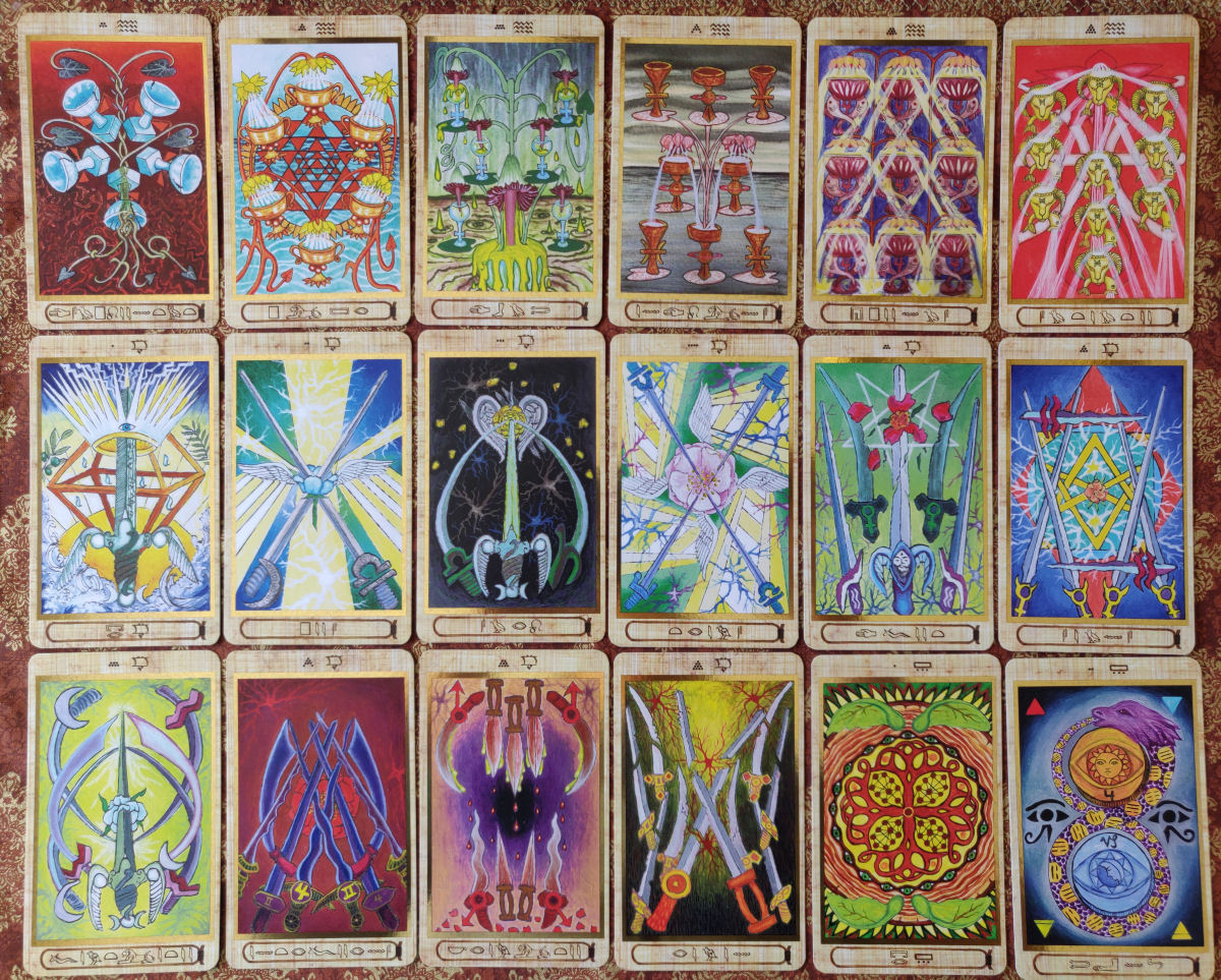 Above, Crowley and Harris’s influence are undeniable, and quite pronounced in the High Priestess, The Chariot, Key 8: Adjustment (more popularly known as Key 11: Justice by way of the RWS), and the Hermit card, though in all of these cases, she’s also made it her own. You’re going to see the physical Thoth influence in the high-concept compositional design in the pip cards and in the dressings of the courts.