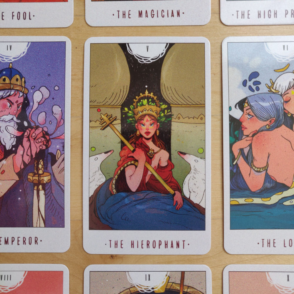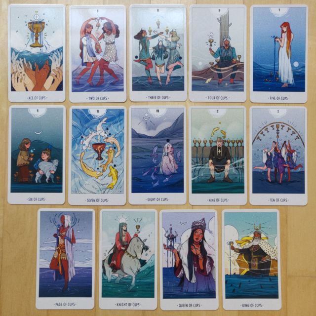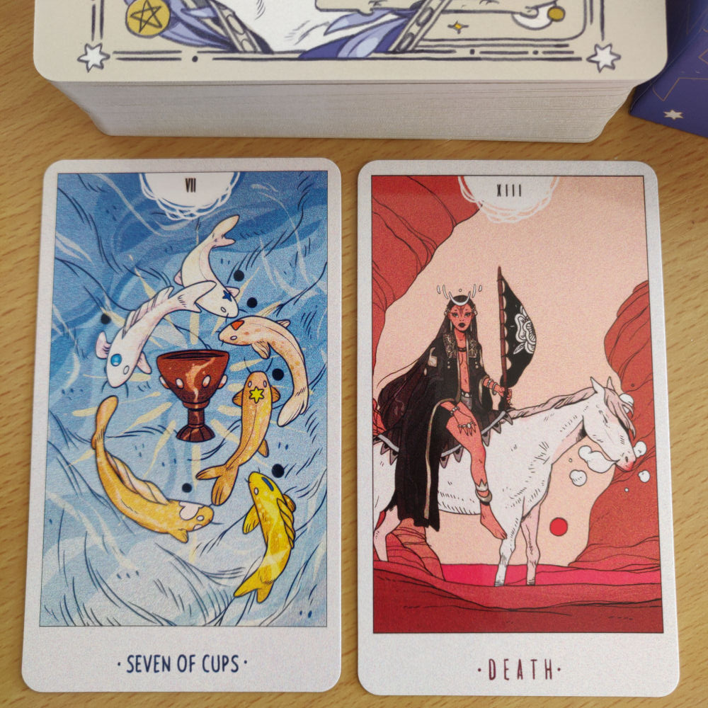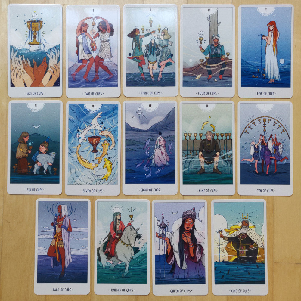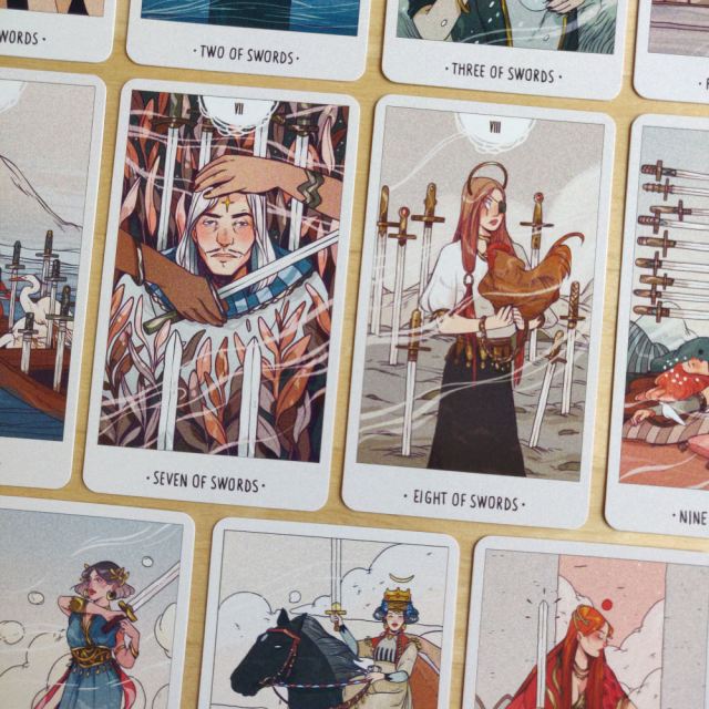 This is an RWS-based deck done in what I think is probably some extent of mixed media, a combination of analogue hand sketching, maybe some traditional media, and digital art. You can check out the artist’s YouTube channel, where she has a lot of really interesting videos on her process.