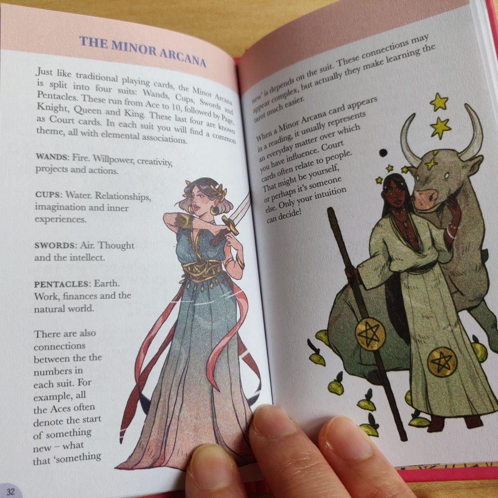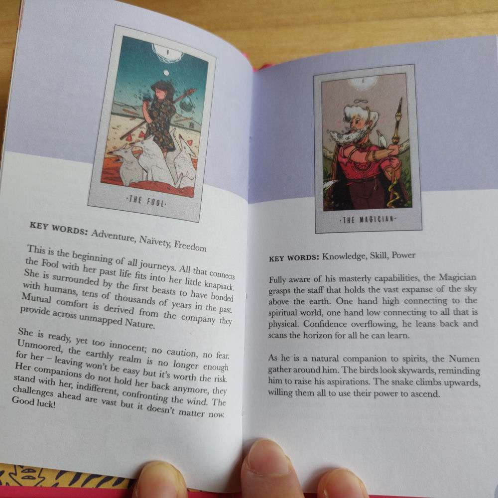 While the Majors are given a full-page treatment per card, card descriptions and ascribed meanings for the Minors are shortened, which is pretty common in standard companion booklets and even in many tarot books.
