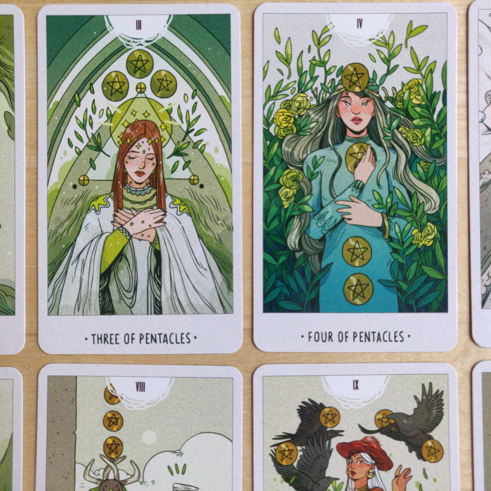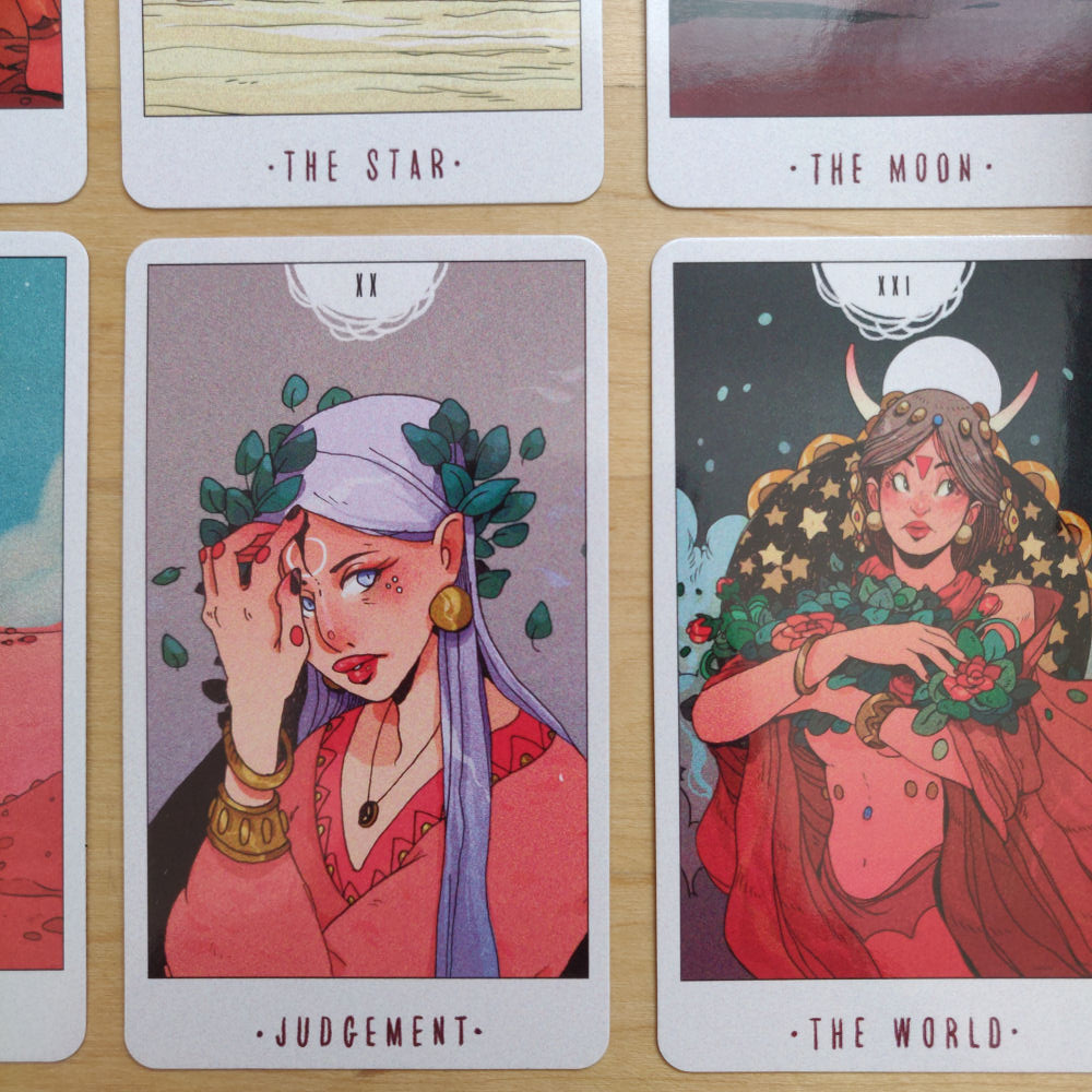 SheΒ begins with the line work, sketching out shapes, then filling those shapes in with detail, and planning out the composition. Then she goes in with color. Finally, she uses digital effects to add texture. I learned a great deal about illustration work from watching her YouTube channel, so I highly recommend it to those interested in illustrating their own tarot or oracle decks.