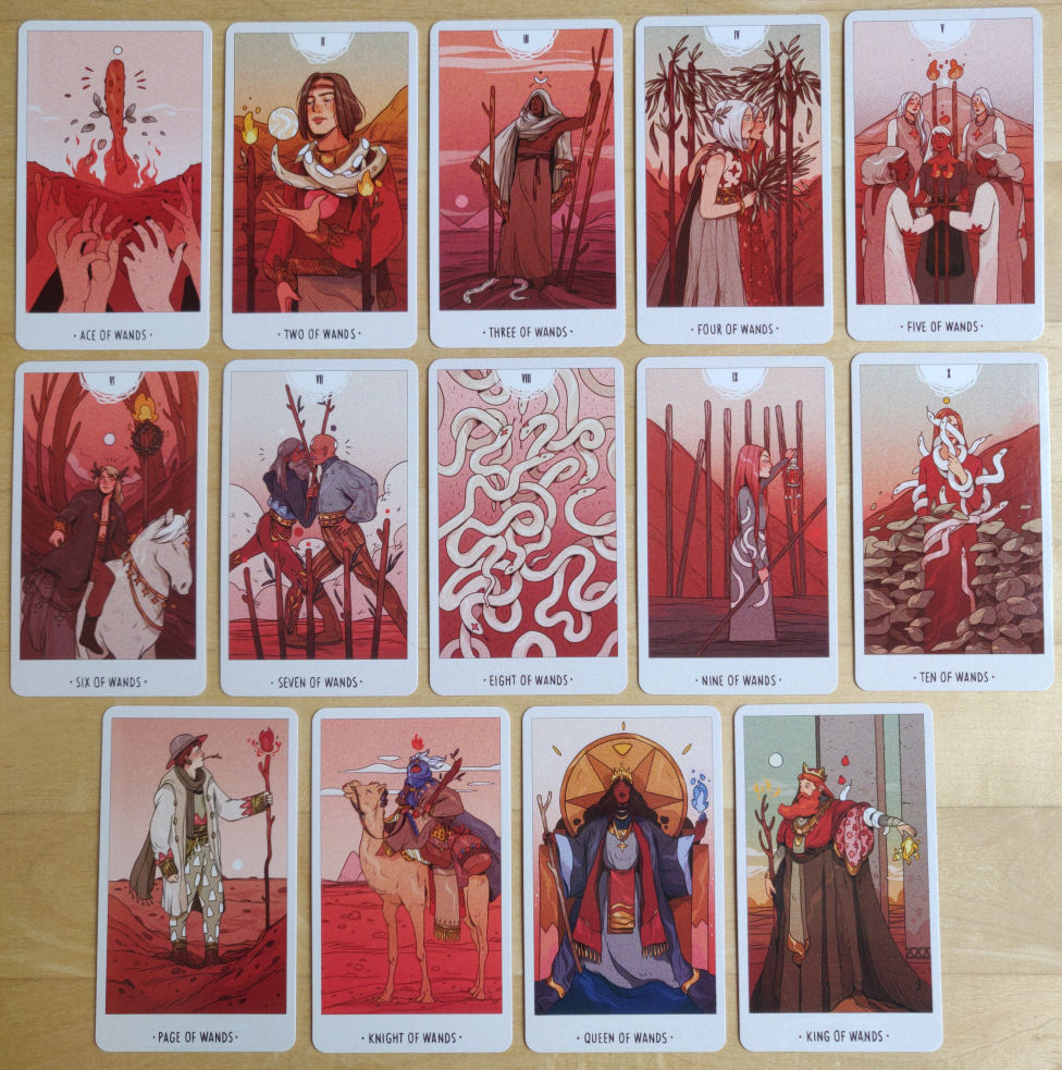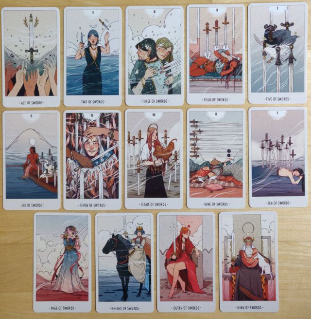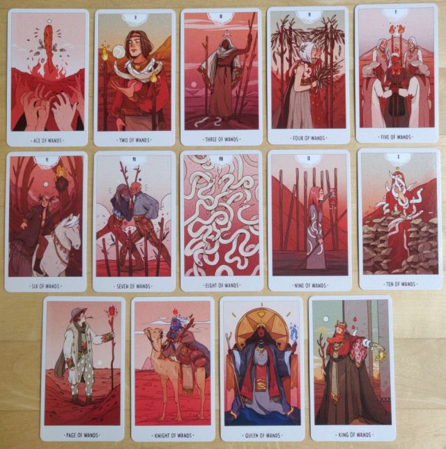 Here you’re going to see how the Minor suits are color-coded, and it’s done in such a way that — I don’t know why, but — reminds me of Avatar: The Last Airbender. The four suits are set up in such a way that they feel like four nations, each with the power to bend that nation’s corresponding element– fire, water, air, or earth.