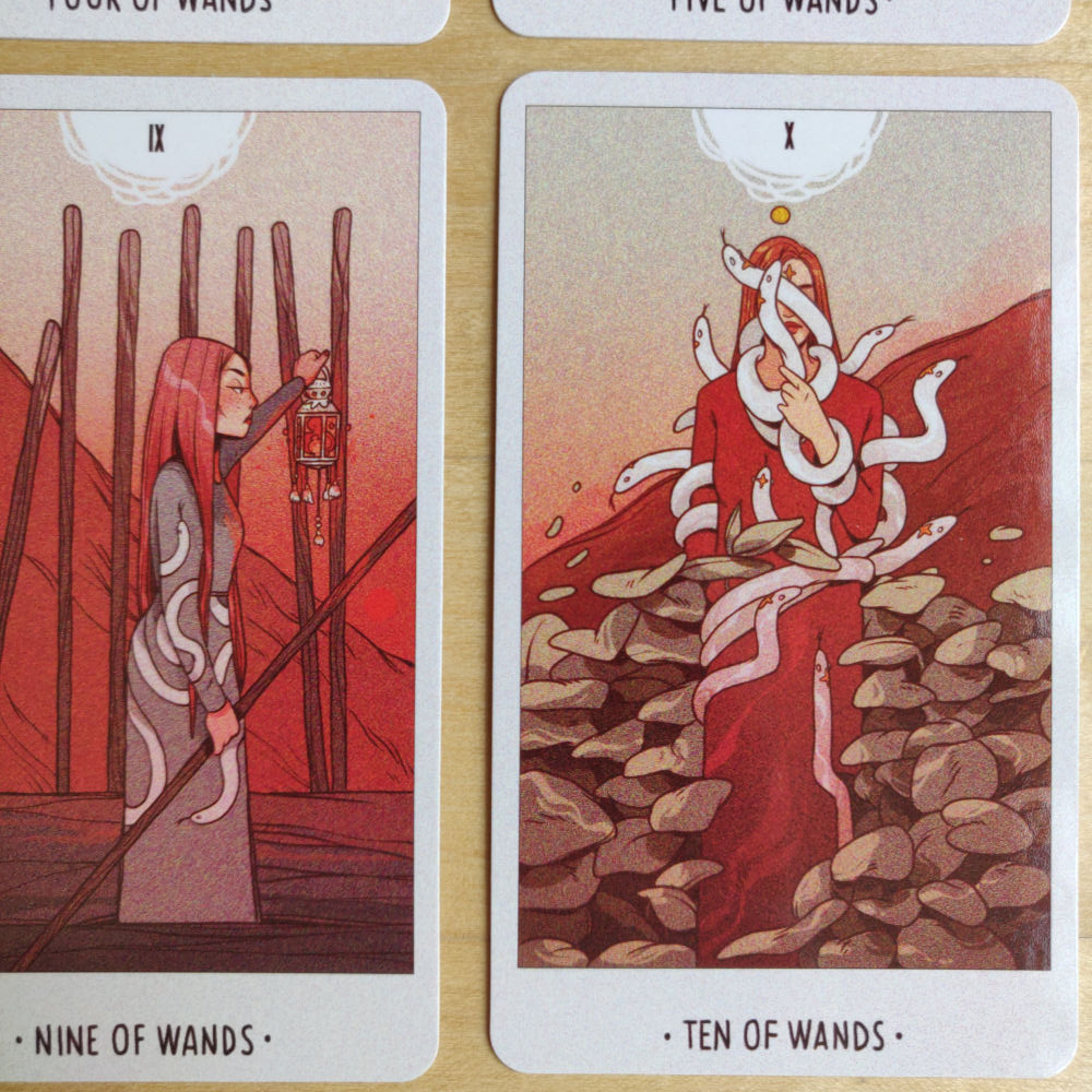 The repeating white snake imagery here intrigued me. You begin with the Two of Wands, coiled around the human figure’s shoulders. You see it under the right foot in the Three of Wands. Then it reappears with all its white snake friends in the Eight of Wands to represent how “everything flows with spontaneity, grace, and speed” (from the guidebook).
