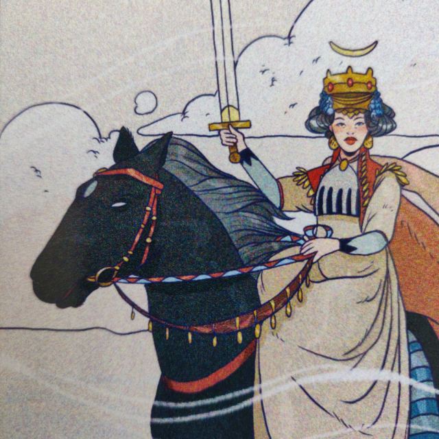 There is so much personality expressed in the human and animal figures. I love the way wind is depicted in this close-up of the Queen of Swords, blowing through the horse’s hair. The horse is even squinting from the wind.