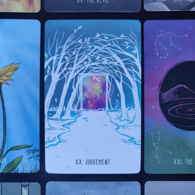 The Judgement card in The Spacious Tarot expresses the existence of a mystical realm alongside the ordinary, and there are these few thresholds, like portals, where one can traverse between the two realms. The Judgement card here, when it presents itself to you in a reading, is just such a threshold revealing its presence.