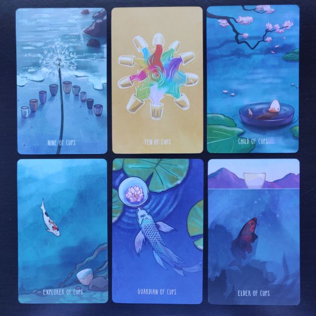There’s a remarkable zen quality to the atmosphere of this deck. I feel instantly calmed when I work with these cards. Some of those illustrations in the suit of Swords, by the way, are brilliant. The Eight of Swords shows seven of the swords tied to the tree, but the one illuminated white is linked to the single freestanding sword beyond–representing how thoughts and one single, seemingly minor shift in perspective can free you. The fog in the background symbolizes the sense of fog you may be feeling in your mind, blinding you from seeing the full scope of your landscape when you’re in an Eight of Swords situation.
