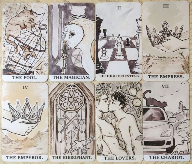 What is so compelling about the Ink Witch Tarot is the storytelling, and Maille’s artistic interpretations of each tarot card. In Key 0, I see The Fool as the bird, who appears to be in a precarious position, but the way that cage is about to fall off the tabletop, the door will swing open and that bird will be freed. If you view The High Priestess illustration as an in-process chess game, either the other side’s pawn is about to take the bishop or the bishop is about to take the other side’s king. Meanwhile both sides’ queens are side by side in the foreground, reminiscent of the traditional High Priestess’s twin pillars.