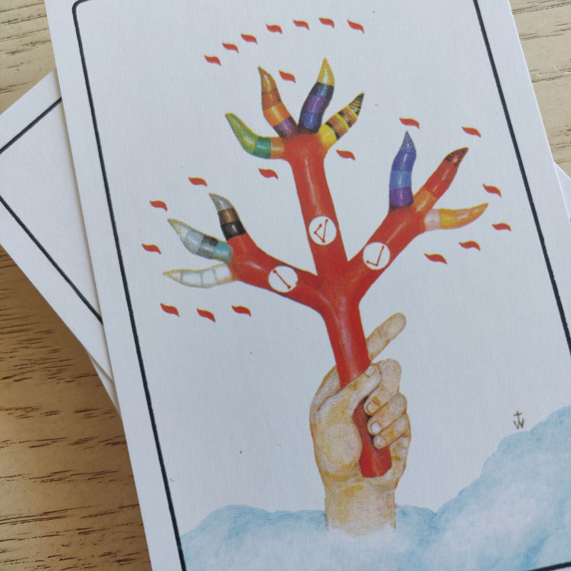 The rest of the symbolism on the card back, I get, was intended to express religiosity from many different cultural vantage points, but might end up being more triggering than inspiring.