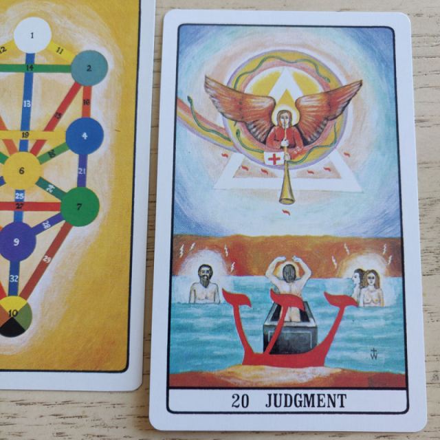 For Key 20: Judgement, Wang writes that the “uninitiated eye” will think this card represents the Last Judgment, but “its meaning is far more occult and recondite than this, for it is a glyph of the powers of Fire.”