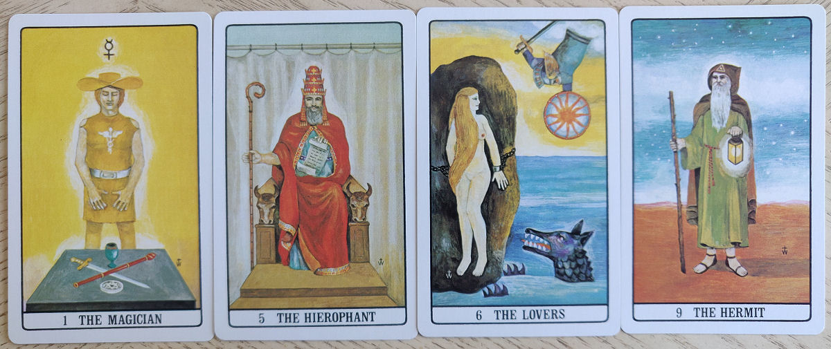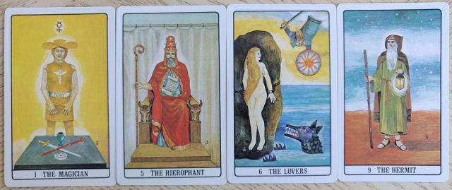 A fun exercise, based on what we’re learning from Wang and his discourse on the Golden Dawn Tarot: From your favorite or your workhorse deck, or whatever tarot deck you’re focused on right now, take out and line up Key 1: The Magician, Key 5: The Hierophant, Key 6: The Lovers, and Key 9: The Hermit cards.