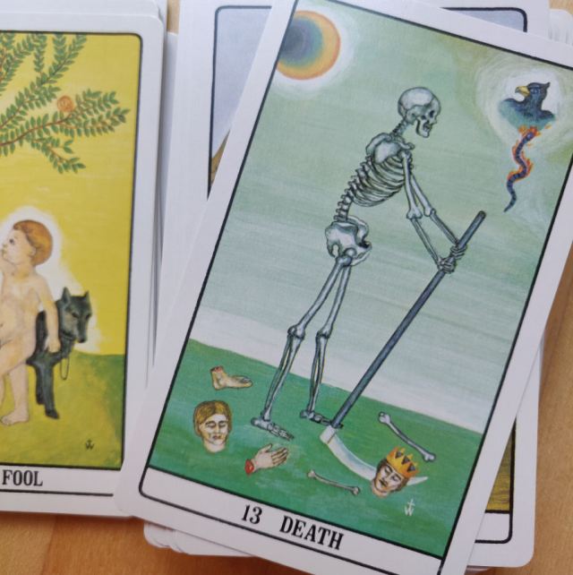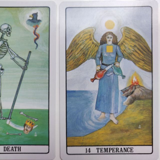 Wang’s writings on the tarot card meanings offer insights into relationships between the cards, through the Golden Dawn framework. He writes that The Hierophant is related as a quarternary set to The Magician, The Hermit, and The Lovers, in that all four of these cards represent aspects of occult wisdom. Another relationship to bear note of: The Death card bears a direct kinship to The High Priestess, and is the opposition or polarity to The Moon card.