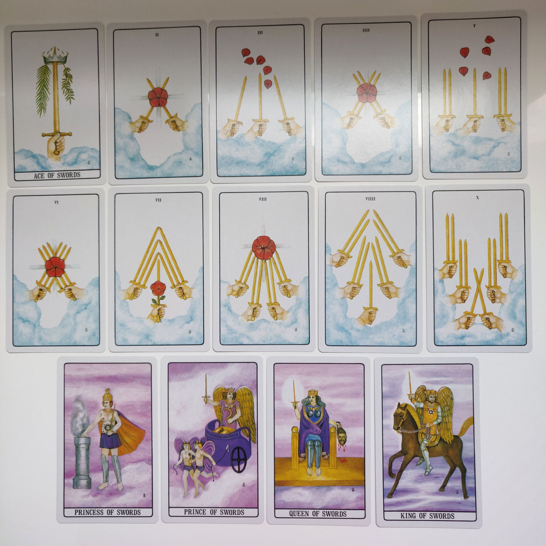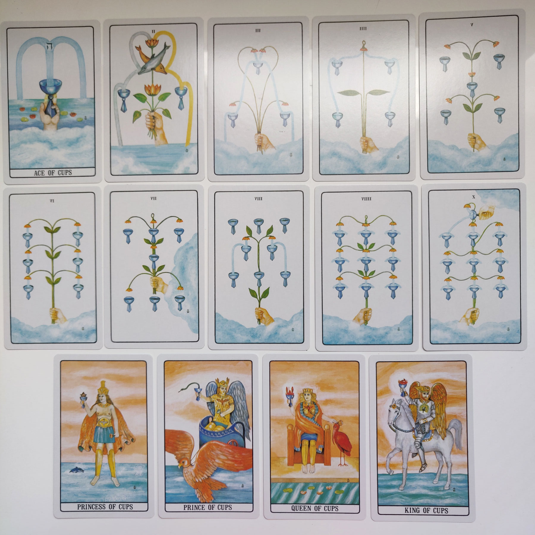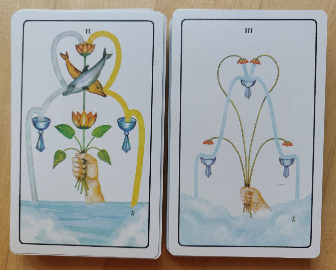 While I appreciate that the pip cards are drawn per the specifications of Mathers and in the Golden Dawn tradition, the compositions are a bit flat and lack visual interest.