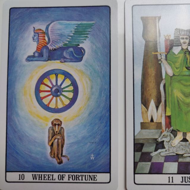In esoteric tarot, Key 10: Wheel of Fortune and Key 21: The World/Universe are connected. The Wheel features the ROTA wheel while in The World/Universe card, the wheel transmutes and reveals itself as the Great Mother ATOR. One aspect of the Great Mother is the goddess Hathor.