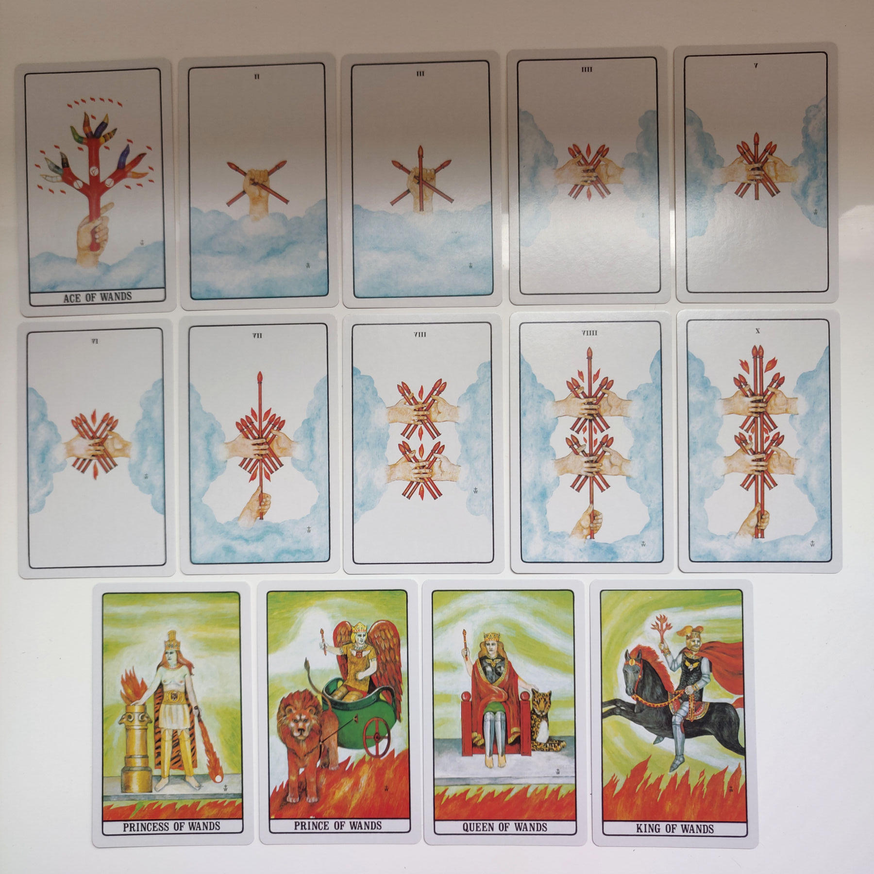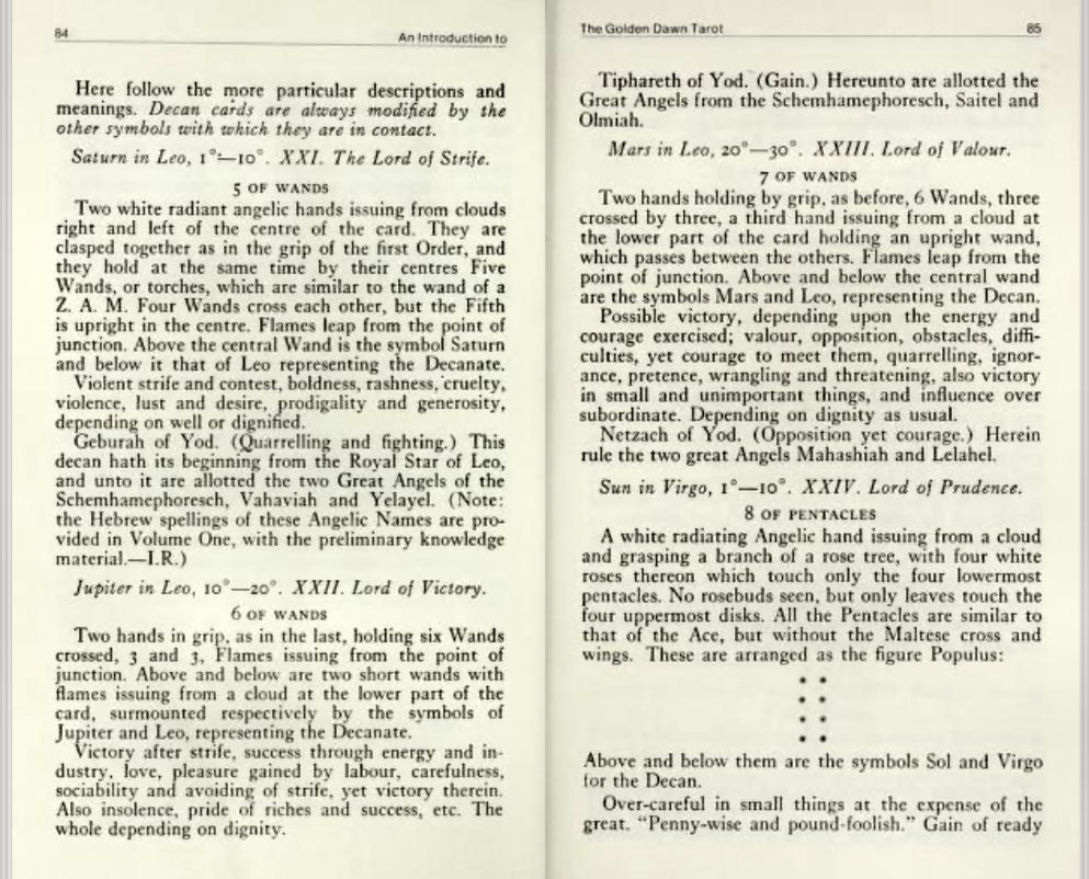 The 158-page companion book delves into detailed descriptions of what’s pictured on each card. The Ace of Wands, for instance, depicts a “radiant Angelic Hand” where the Club has “three branches in the colours and with the Sigils of the Scales.” The flames symbolize the ten sephiroth of the Tree of Life. All four Aces in the Golden Dawn Tarot depict the Angelic Hand.