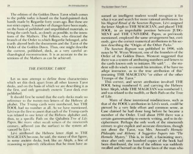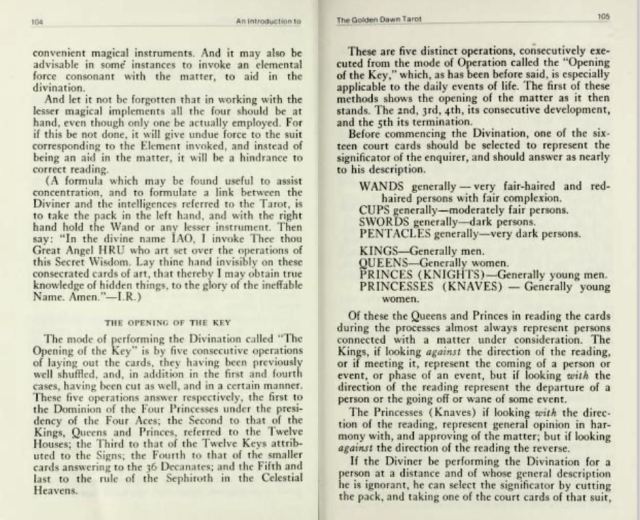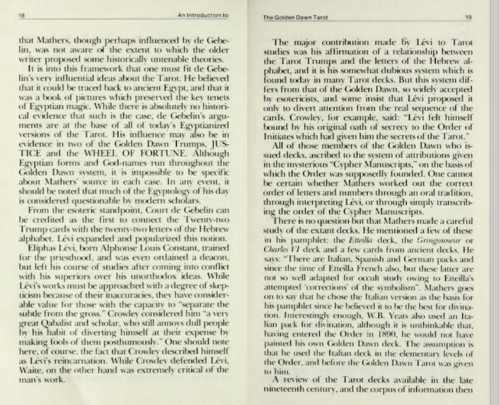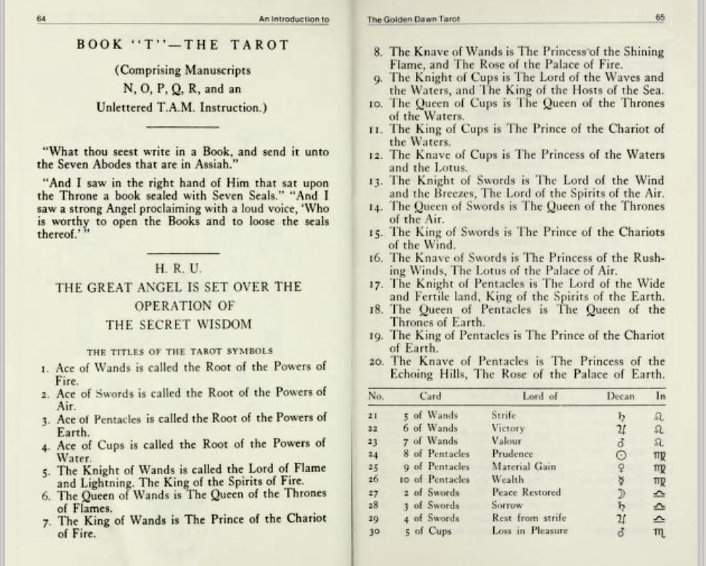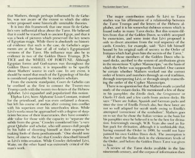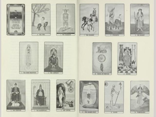 Regardie released most of the Order’s secret teachings in The Golden Dawn (1937-40), and completed the full release of those teachings with the instructions embedded into this deck, the Golden Dawn Tarot, as illustrated by Wang.