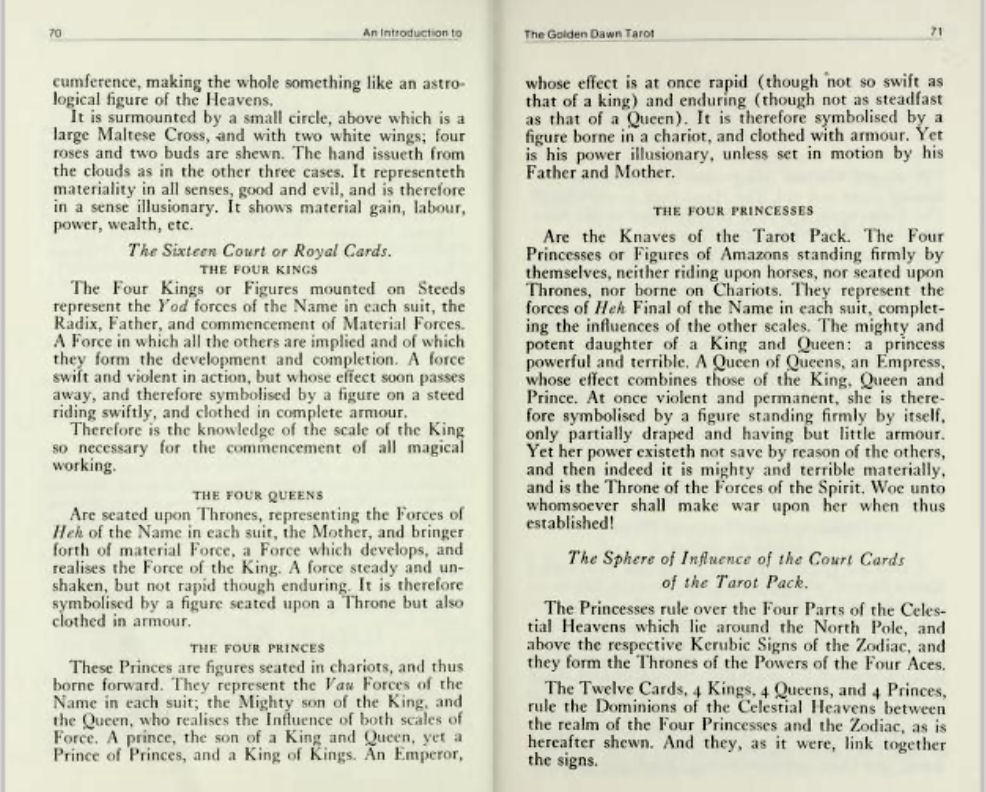 For instance, the Knights (Kings) correspond to the four elemental mythic creatures– the Knight of Wands rules over the salamanders, the Knight of Cups rules over the undines and the nymphs, Knight of Swords over the sylphs and slyphides, and the Knight of Pentacles over the gnomes. Queens are the feminine counterpart sovereign over the four beasts, i.e., queen who rules over the salamanders, queen of the undines, etc.