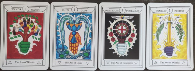 The Minor Arcana represent the “fixed and static energies of the Sephiroth, compared to the paths of the Trumps, which are active and moving.” These are 56 immutable characteristics of the human psyche, inherent within all of us. The 16 court cards represent personality; the Aces are facets of divinity within.
