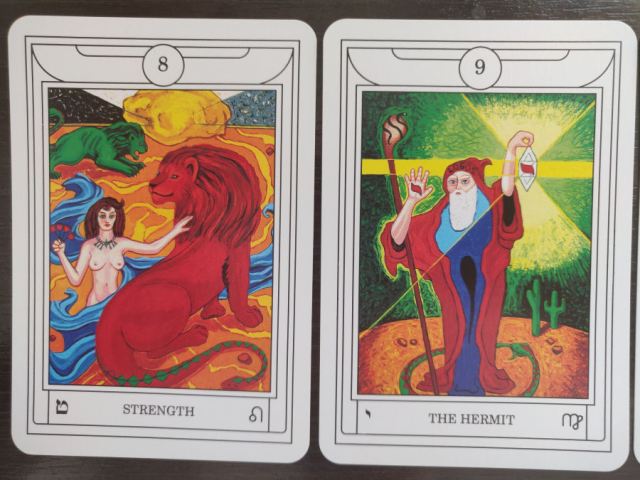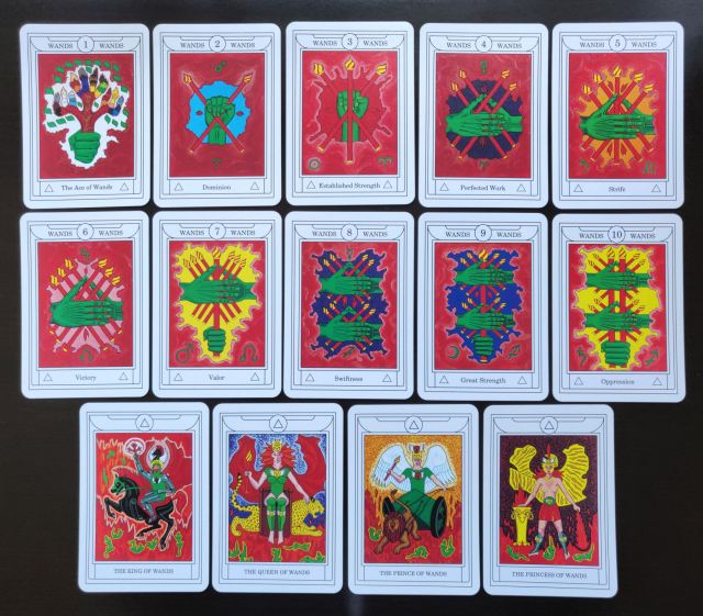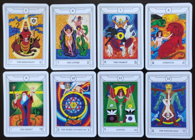 The bold colors, sharp contrast, and complete fill of the canvas with minimal negative space brings an animation and sense of life to these cards, whereas that naive-style colored pencil and watercolor art commonly found on other Golden Dawn occult decks can often feel flat.