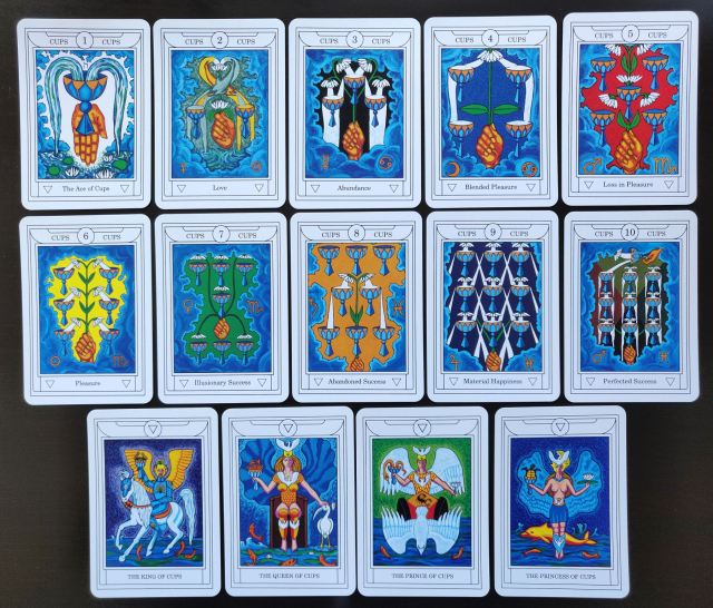 Like the pip cards in The Golden Dawn deck, the suit relics (e.g., the Cups) are presented by a divine hand. The pips here are rendered in the same way, as instructed in the MacGregor Mathers texts. It’s fascinating to see how two different artists apply coloring and how they interpret a written text of instructions into these pictorial representations. Substance-wise, they’re similar, and yet style-wise, they’re different.
