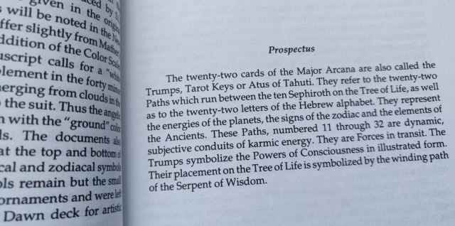 The entry for each card describes what’s pictured on the card illustration, why, such as the lunar crescent crown and the water cup of the Stolistes you see here, how to interpret the card in divination, and its Qabalistic correspondences. “The High Priestess is a form of the Shekinah, the spiritual Bride and Mother,” notes the text. Its relative Keys are Key 13: Death and Key 18: The Moon.