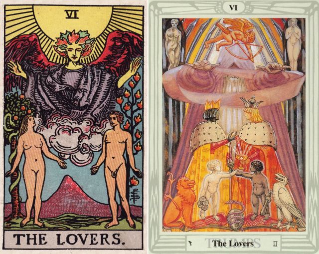 This theme that you see in the Regardie-influenced decks wasn’t found in Crowley’s Thoth version of The Lovers, however, whereby Crowley went with a more decidedly alchemical figurative representation, closer thematically to Waite’s Key 6 than the Perseus-Andromeda metaphor.