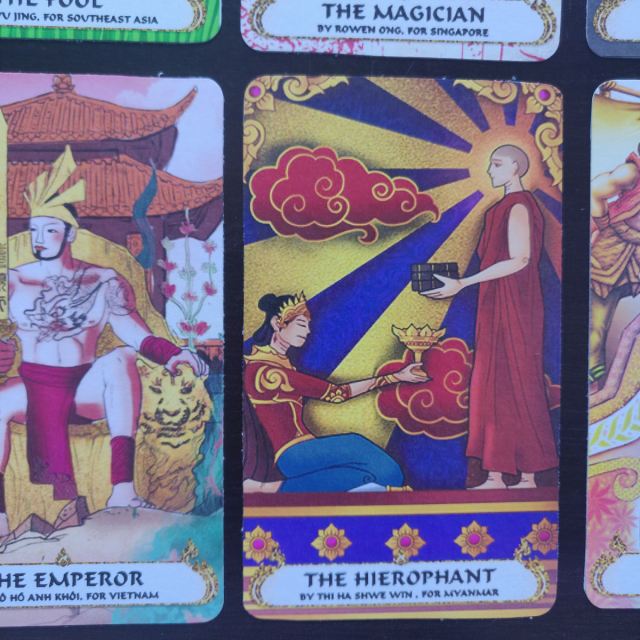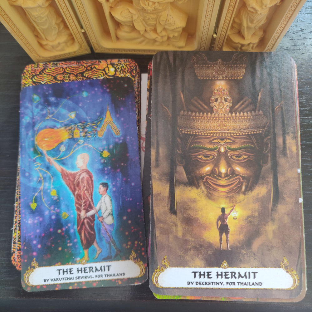 The Hermit card features Lersi, hermits that pre-date the Gautama Buddha. The Hanged Man tells the Vitnamese tale of a poor woodcutter who discovers a banyan tree possessing healing properties.