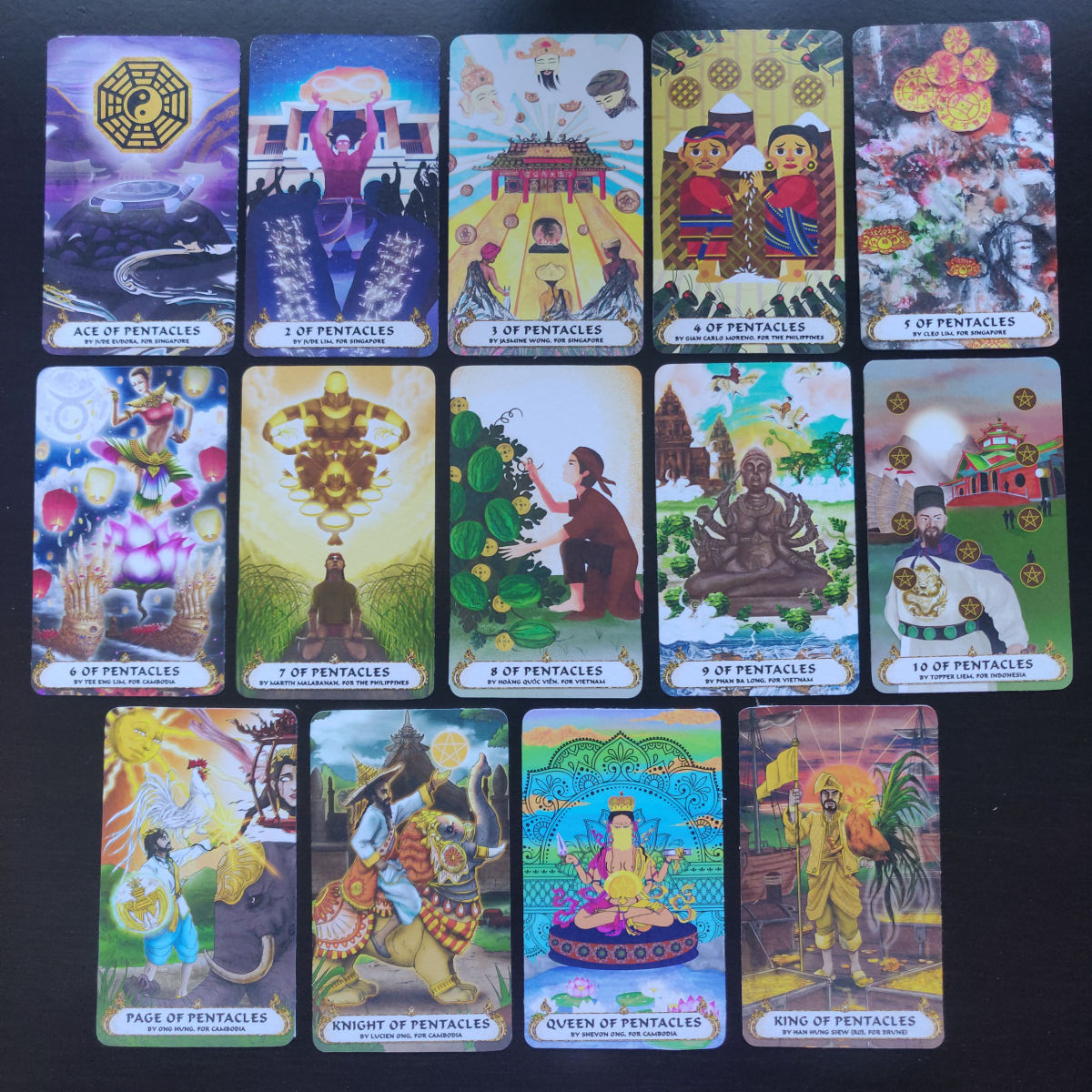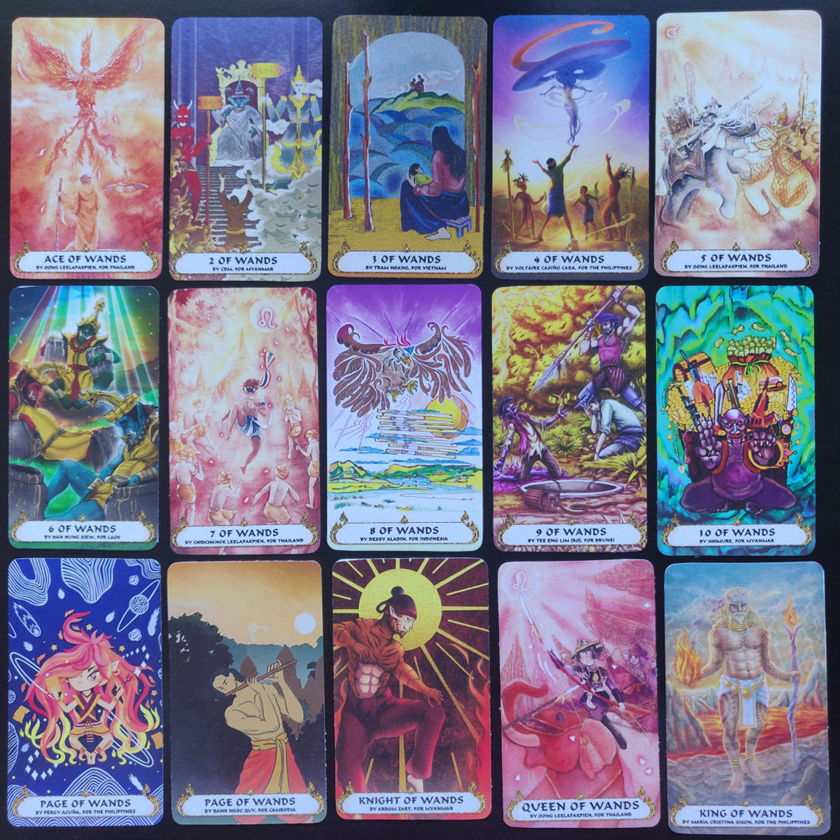 Two passionate tarotists, Rowen Ong (Singapore) and Lynyrd-Jym Narciso (Philippines) spearheaded the project. You might know Narciso as the artist for the Vanessa Tarot (U.S. Games).