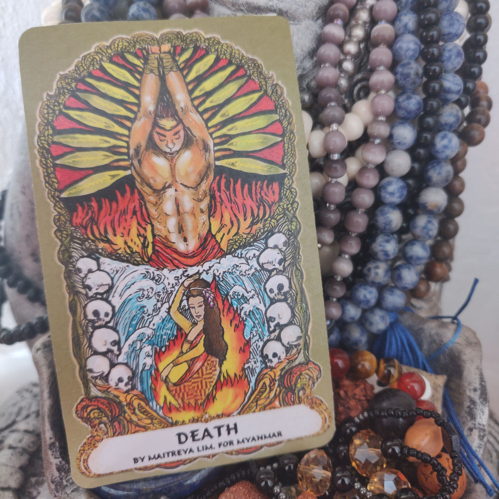 The Death card depicts Maha Giri Nat and Saw Meiyar Nat, brother and sister spirits of the dead.