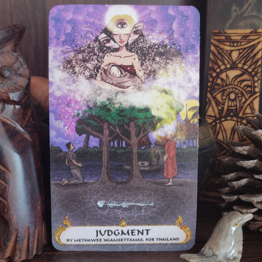 As you work with the Judgment card, learn the story of Mae-Nak, or Lady Nak of Phra Khanong. Local legend holds that after Mae Nak’s husband went off to war, she and her child were killed. But they didn’t realize they had died. When Mae Nak’s husband returned from war, they went back to domestic bliss, and he doesn’t realize he’s living with a ghost wife and ghost child until much later. (Random side commentary: No one ever explains the logistics of that…)