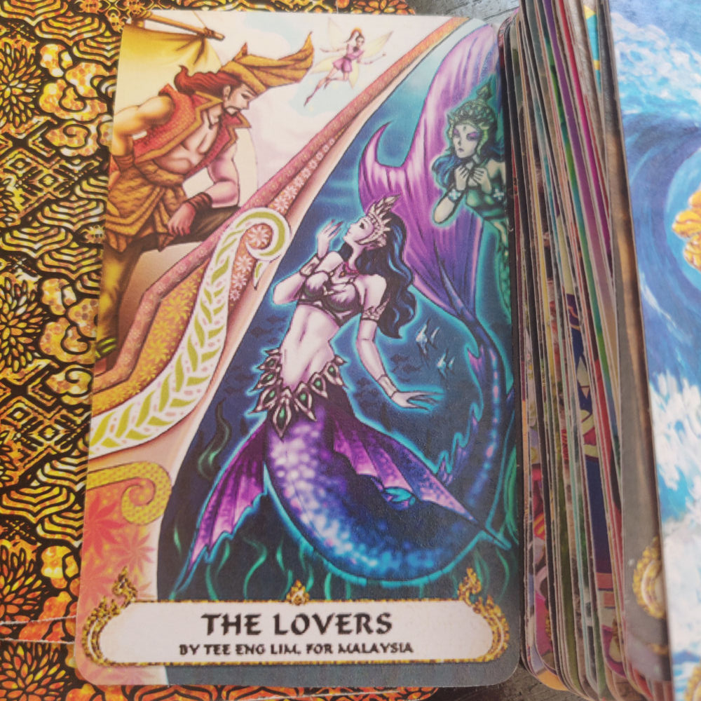 The Lovers card tells the Malay myth of a sea princess who fell in love with a fisherman, though the story does take a bit of a dark turn (much like The Little Mermaid story this audience is more familiar with).