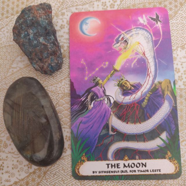 The Moon card tells the story of sleeping Beleira, a giant, and his wife who tried to save him from a fearsome boa.
