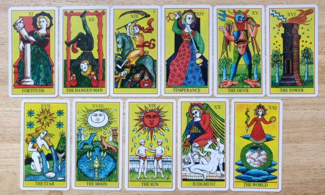 The Major Arcana are based chiefly on the historical Italian and French tarot decks– continental decks, as Christine Payne-Towler might put it. Key 8 is Justice and Key 11 is Strength. I love the illustration that Huson and Alligo went with for XI. Fortitude. I can’t now recall off the top of my head which historical deck that’s from, but I’ve always liked that version of Strength and felt it was a bit underrated. It’s a more classic and symbolic depiction of the cardinal virtue of Fortitude.