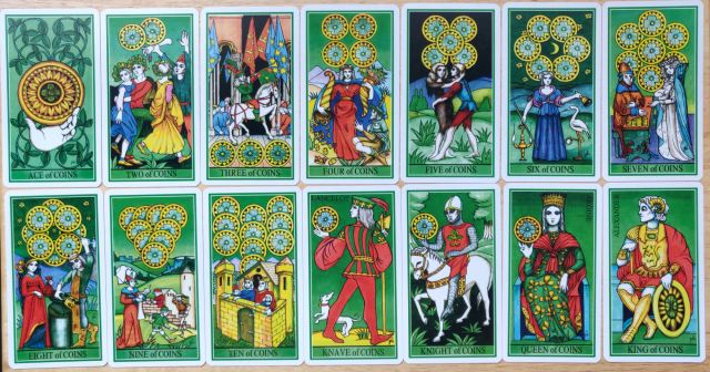 The four suits are representative of the four cardinal virtues. Above, the suit of Coins (or Mirrors) is emblematic of Prudence. Prudentia, the allegorical female depiction of the virtue, is typically pictured holding a mirror and with a snake. In divination, Coins cards will address money matters.