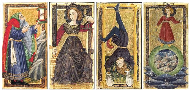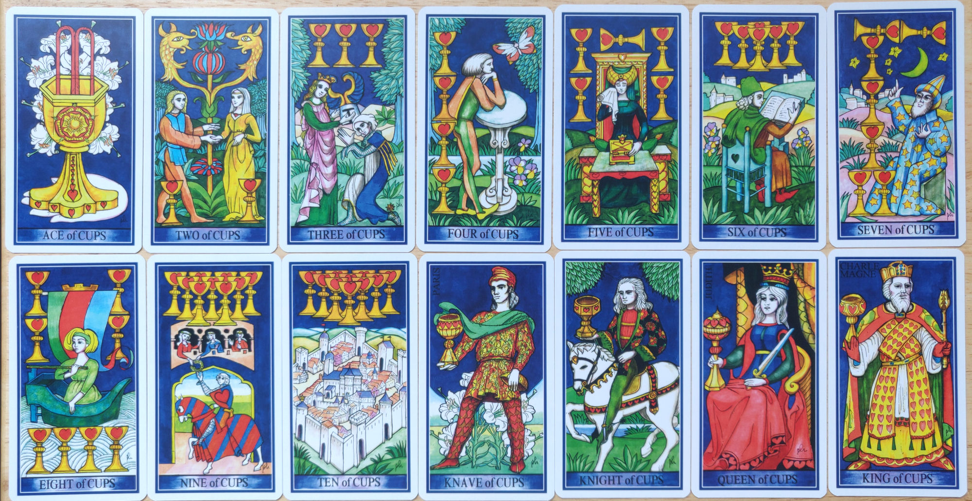 The Minor Arcana are scenic, depicting everyday situations, with the artwork inspired closely by engravings and paintings in illustrated manuscripts medieval and early Renaissance sources.