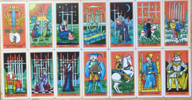 The suit of Swords corresponds with the cardinal virtue of Justice, and in divination, will relate to authority figures. Notes the LWB that traditionally, the suit of Swords was the suit of misfortune, division, and disappointments. All things unhappy, basically. But modern readers have reinterpreted the suit to mean decision-making and discernment.