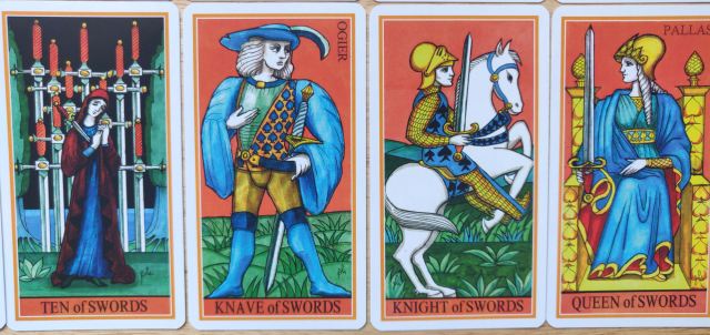 The court cards portray characters well-known to medieval romance. The Knave of Coins, which you’ll see below, is Lancelot; the King of Coins is Alexander the Great. Above you’ll see that the Knave of Swords is Ogier the Dane. The Queen of Swords is Pallas.