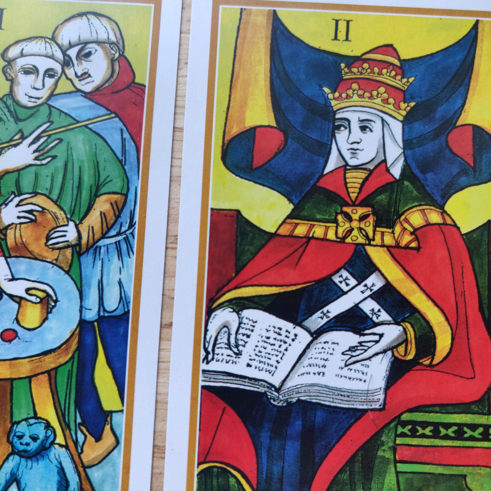 The LWB notes that Huson has blended traditional tarot card designs with French playing card patterns (known as the standard pattern of Paris), and you can see that inspiration in the way faces are depicted. The above close-up of The Female Pope (based on the lore of Pope Joan) shows that familiar European playing card style of illustrating faces.