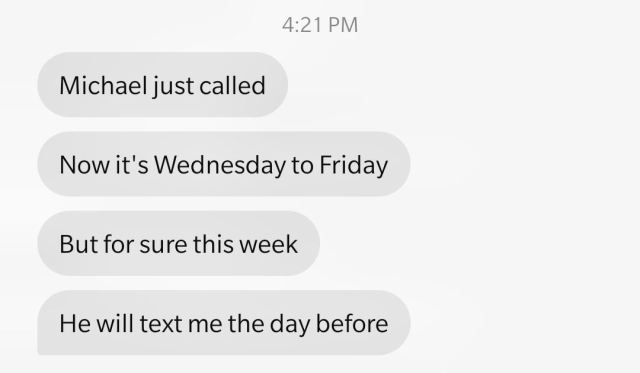 Michael is the broker dude. I was at the office when James texted me the above. 4:21 pm today, Oct. 4, 2021. So there you have it. We will receive delivery of the shipment some time between Wednesday and Friday. At the rate of my luck right now, let’s just say it’s gonna be Friday. =)