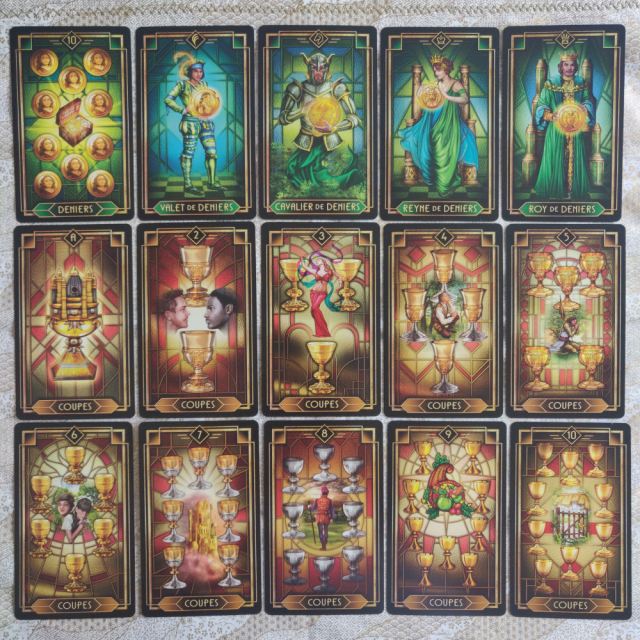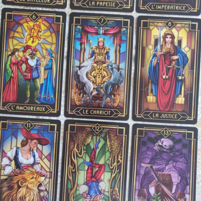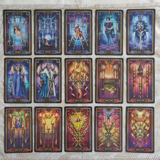 The pips in this deck are Marseille in composition, with the addition of beautiful vignettes based on the RWS. The stained glass backgrounds on the pip cards are colored to match their corresponding numbered Key from the Majors.