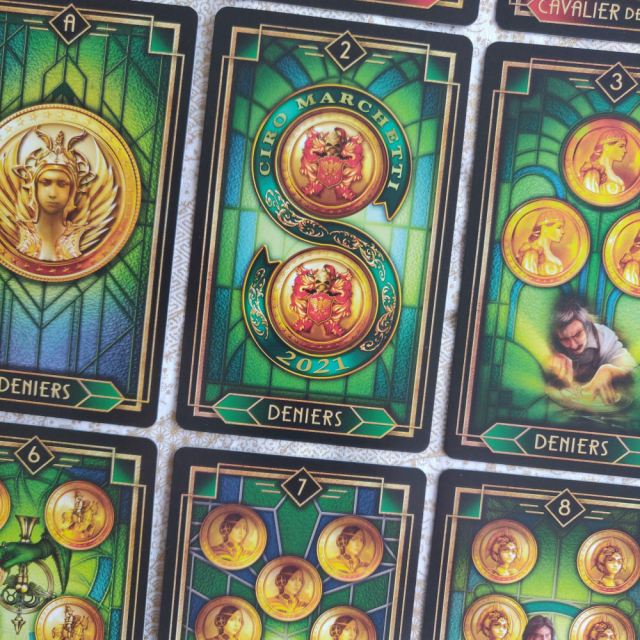 For example, the Two cards in the four Minor Arcana suits feature a stained glass background that connects them to Key 2: La Papesse (The Priestess). Imagery in the backdrop of the four Sevens connect these four cards to Key 7: The Chariot, and so on.