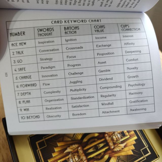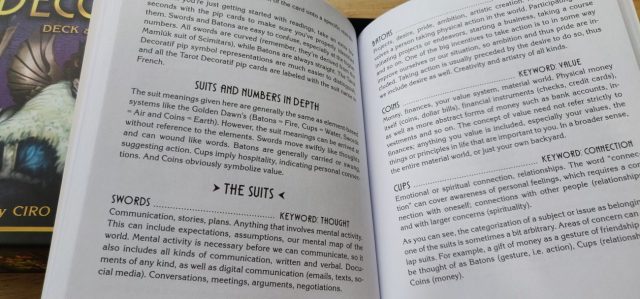 If you’re an RWS tarot reader looking to learn the TdM, then get this deck and book set. You’re going to love the RWS-inspired vignettes on these pips. They almost serve as training wheels.